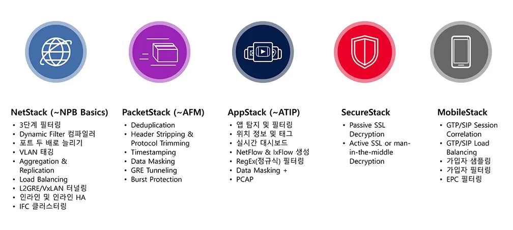 트래픽 통합 및 필터링, 중복제거, 부하분산, SSL 복호화, Netflow 패킷 해더 제거 기능